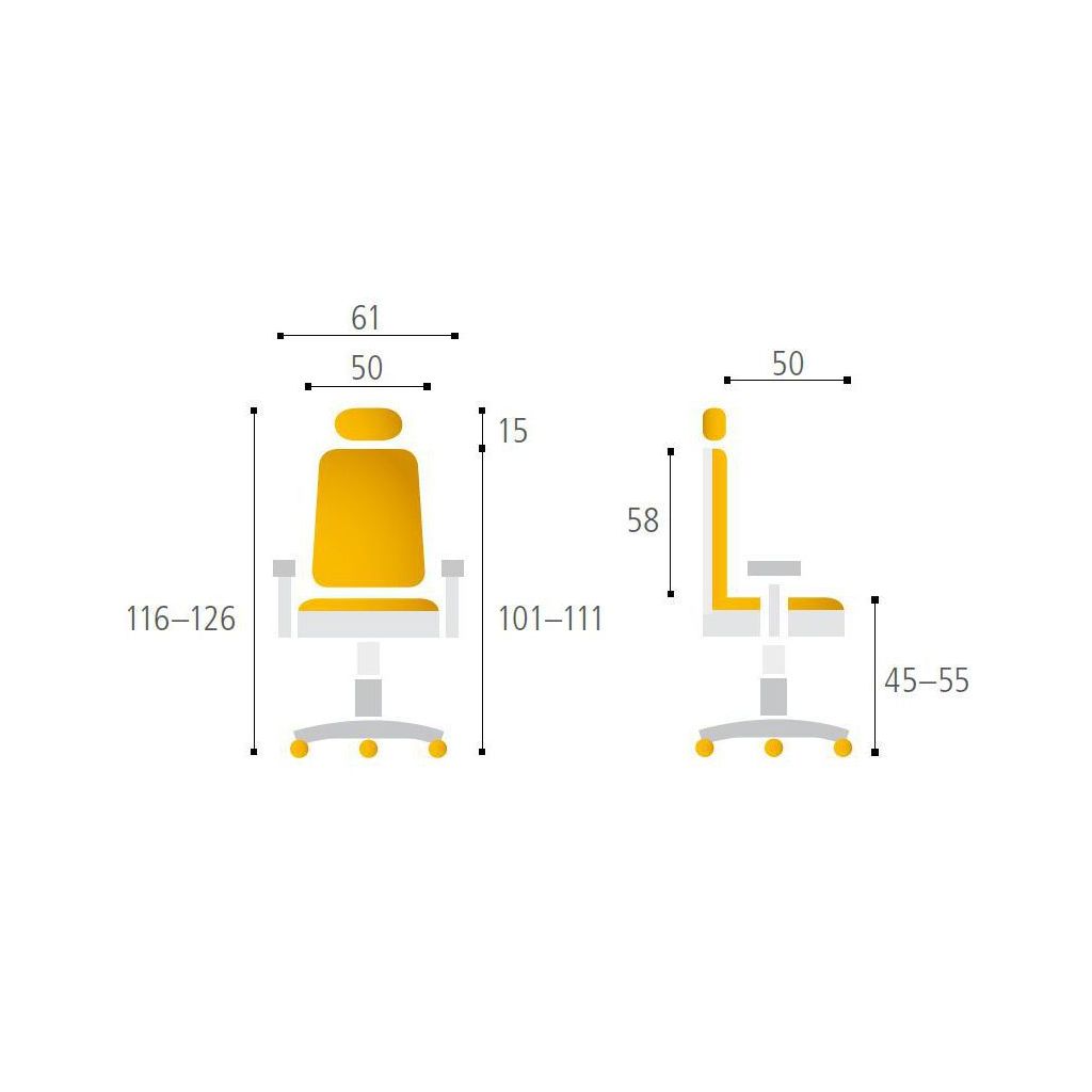 Kancelárska stolička čalúnená s vysokým operadlom. Synchrónny mechanizmus so 4 polohami blokovania. Nastavenie sily protiváhy- podľa telesnej hmotnosti. Výškové nastavenie sedáka. Anatomicky tvarovaný sedák. Obojstranne čalúnené operadlo samonosnou sieťovinou. Výškovo nastaviteľné podrúčky. Nosnosť 120 kg.
