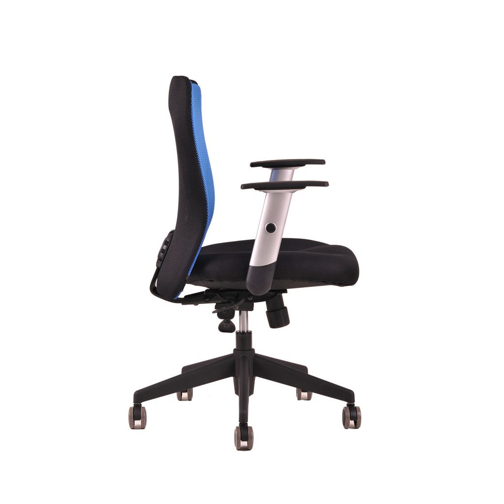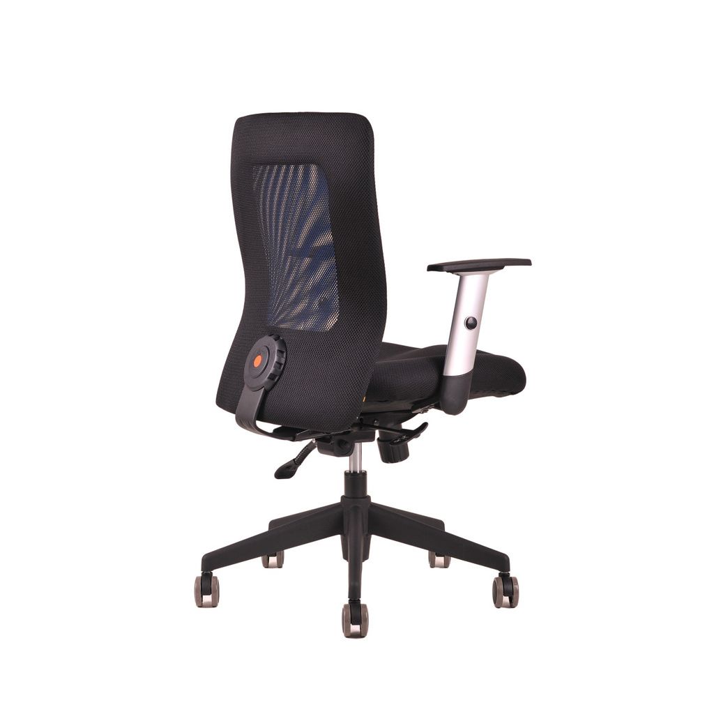 Kancelárska stolička čalúnená Calypso. Synchrónny mechanizmus so 4 polohami blokovania. Nastavenie sily protiváhy- podľa telesnej hmotnosti. Výškové nastavenie sedáka. Anatomicky tvarovaný sedák. Obojstranne čalúnené operadlo samonosnou sieťovinou. Výškovo nastaviteľné podrúčky. Sedák a zadná strana chrbátu vždy čierna.