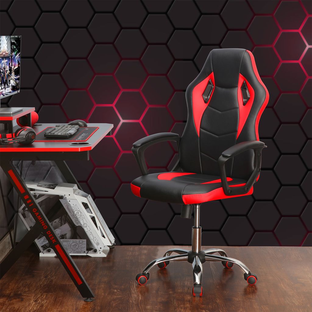 poťah koža – imitácia, farebné prevedenie čierna / červená výškovo nastaviteľné, hojdací mechanizmus chrómovaný kríž, PU kolieska v červenej farbe