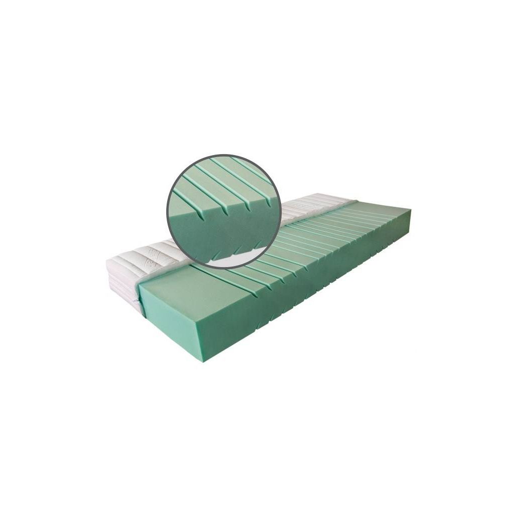 Matrac je vyrábaný v rozmere 80x200 cm, 90x200 cm, 100x200 cm, 110x200cm, 120x200 cm, 140x200 cm."}">Konštrukcia so špeciálnym štrukturovaným povrchom v oblasti ramien, bedrovej časti a chrbáta garantuje výborné prispôsobenie sa telu a optimálne prúdenie vzduchu, vďaka čomu je zabezpečený ideálny spánok. Jadro matraca je vyrobené z veľmi elastickej PUR peny o vysokej objemovej hmotnosti s čiastočným podielom prírodného oleja. Veľká výška jadra matraca v kombinácii s veľmi nízkym ( zmäkčeným ) odporom peny zisťuje vysoký komfort ležania a veľmi dobrú podporu tela.