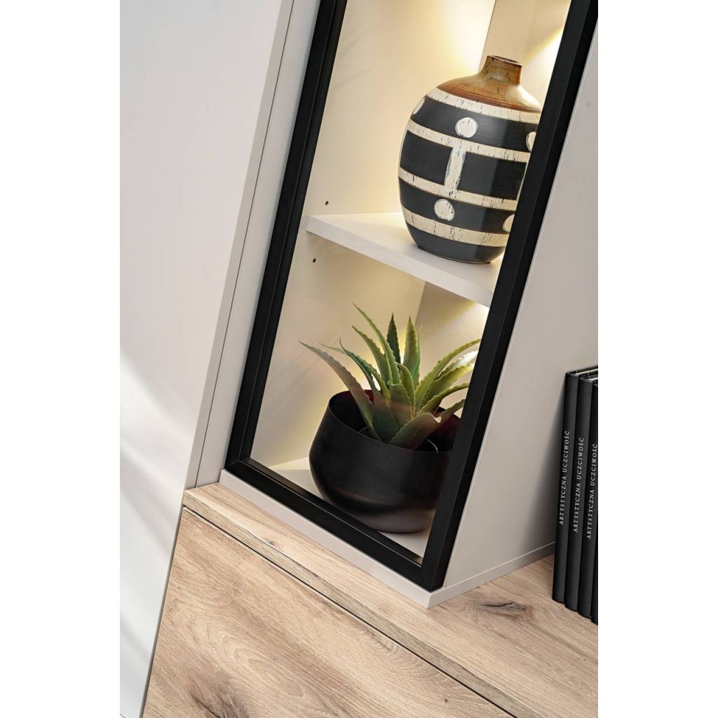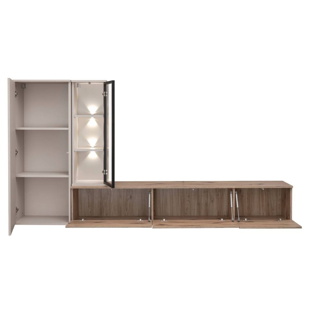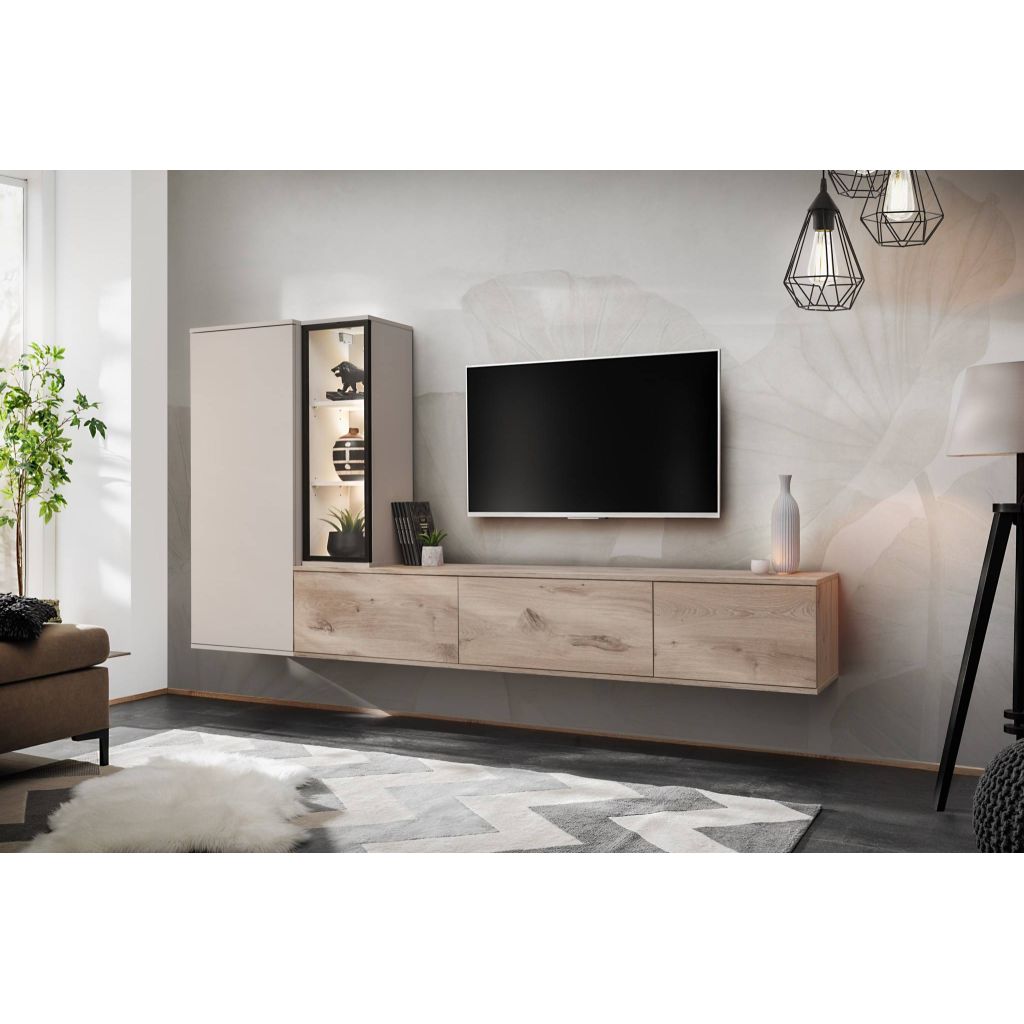 - Závesná obývacia stena CLARE obsahuje televízny stolík (3x výklopná skrinka), 1x plná skrinka, 1x skrinka so sklom