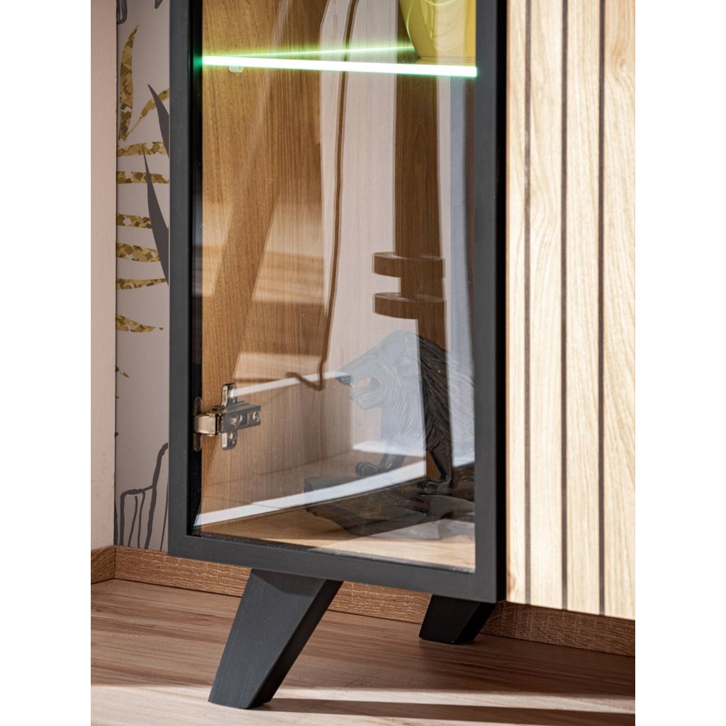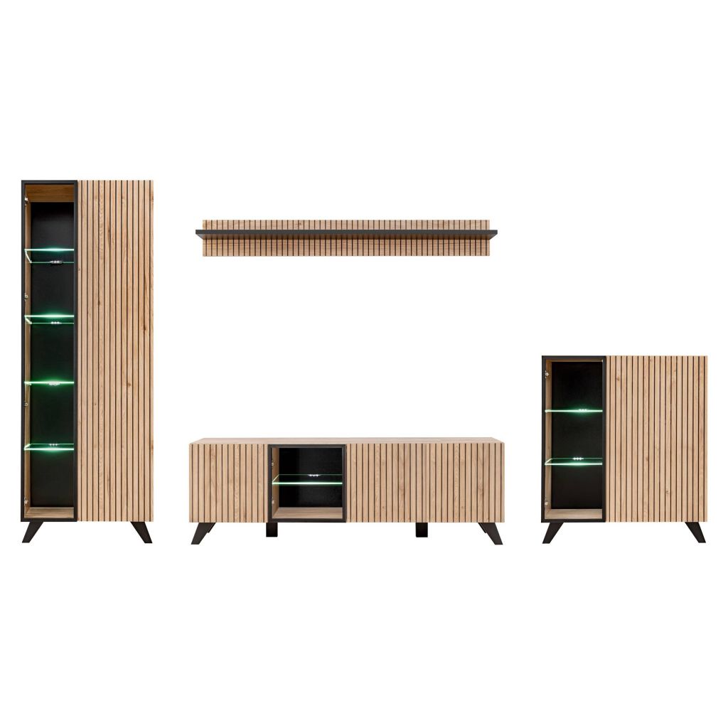 - Obývacia stena LIAM s vysokou vitrínou, TV stolíkom, závesnou policou a nízkou vitrínou