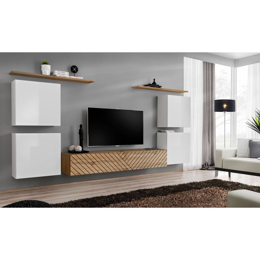 • Závesná obývacia stena SWITCH IV LAMEL s TV stolíkom, závesnými skrinkami a policami