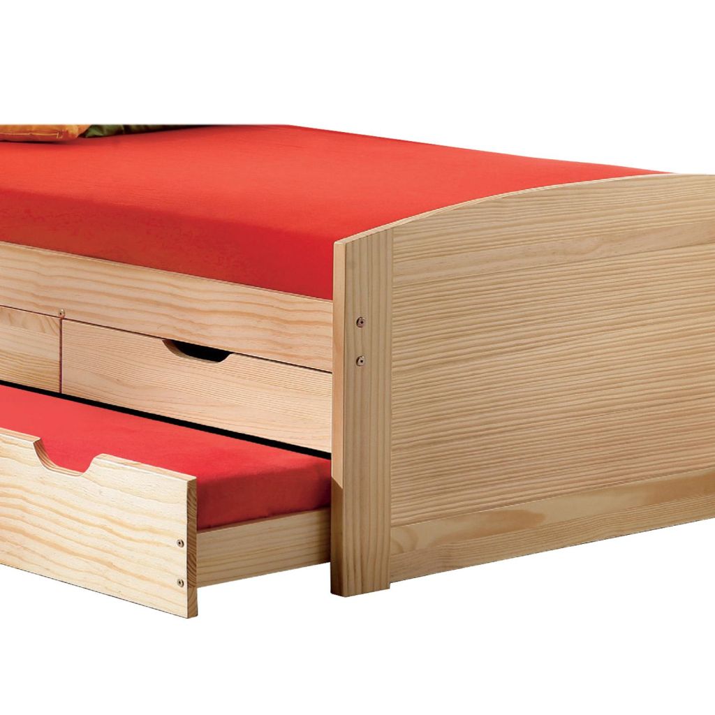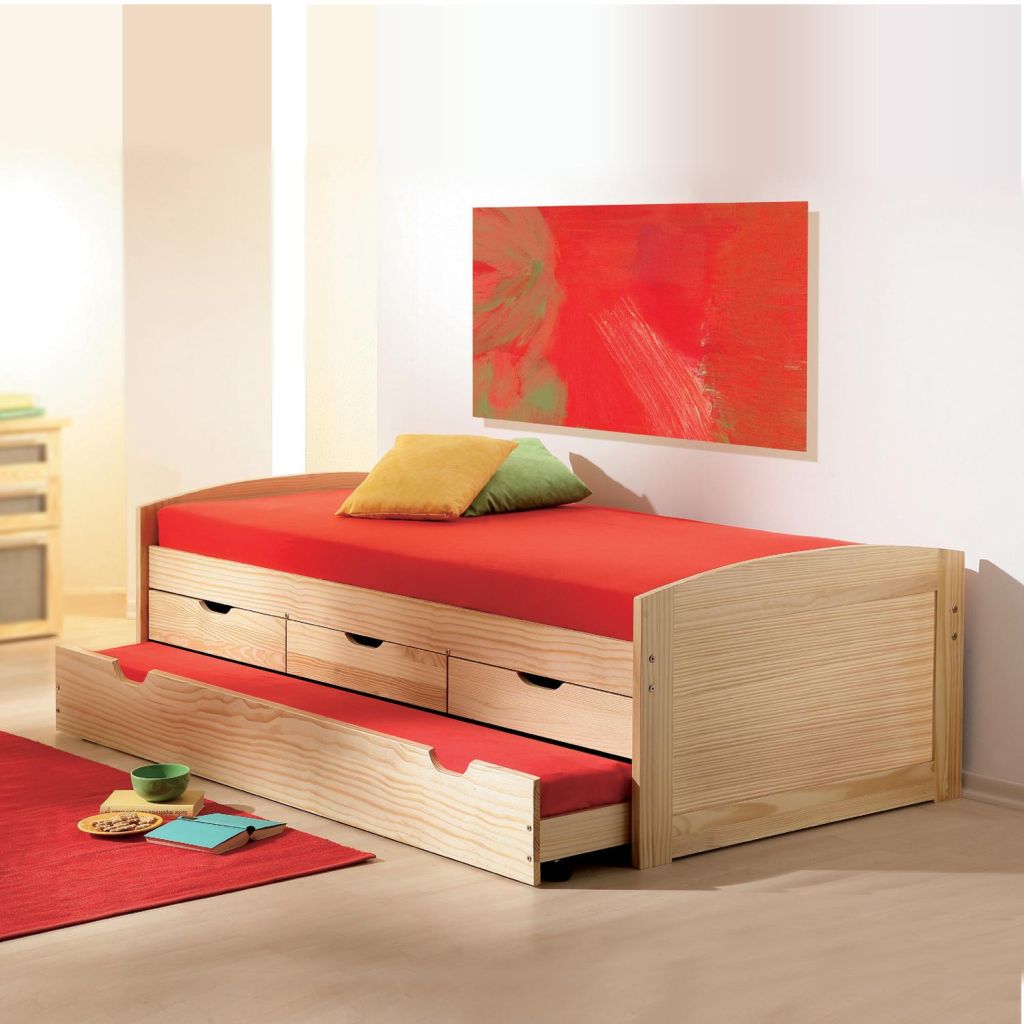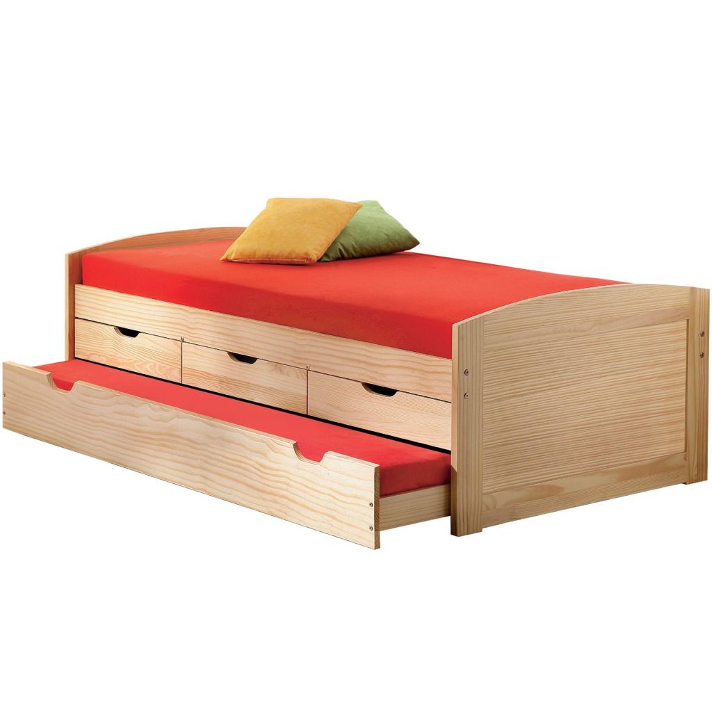 materiál masív borovica, lakované prevedenie výška sedu 52 cm, praktické úložné priestory pod posteľou (3 zásuvky a výsuv) sú v cene cena vrátane roštu (drevený latkový) bez matraca, odporúčaný rozmer matraca 90 × 200 cm výsuv možné po doplnení o rošt užívať tiež ako prístelku (rošt nutné doobjednať zvlášť, odporúčaná výška matraca do 10 cm)