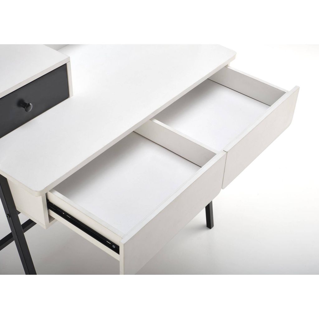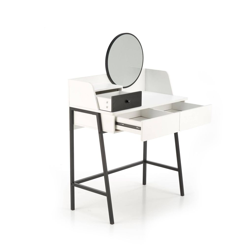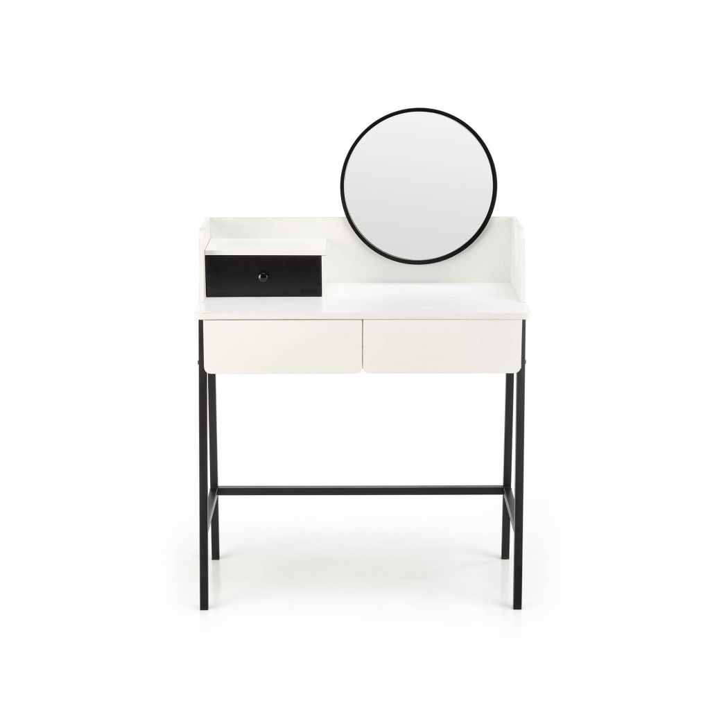 Toaletný stolík AGNES je dizajnový kúsok, ktorý skvele kombinuje štýl, funkčnosť a moderný industriálny charakter. Vďaka svojmu prevedeniu v čiernej a bielej farbe a kovovým nohám pôsobí elegantne, no zároveň odľahčene – ideálne zapadne do loftového či moderného interiéru.